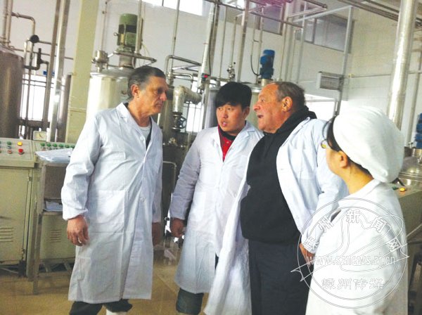 经省外专局牵线,以色列Ambar公司的莱诺和易世道尔两位乳牛养殖专家到绍兴一景乳业有限公司进行为期15天的志愿服务,这有利于公司接轨乳牛的国际养殖技术。图为外国专家在一景公司工作的现场。