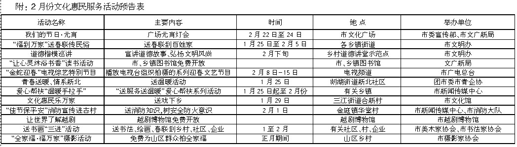 为深入贯彻十八大精神,进一步提高文化惠民服务活动信息在市民中的知晓率,提升文化活动覆盖面与影响力,让更多的群众共享文化发展成果,丰富精神文化生活,我市建立了文化惠民服务活动信息综合发布平台。