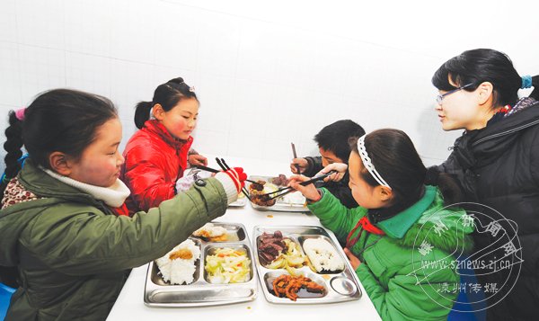 1月24日中午,贵门乡中心学校的一些学生正在吃爱心营养餐,该校共有59名贫困生可以享受这样一天一次的爱心营养餐。据悉,去年我市共补助资金353.3余万元,确保了1.18万人次贫困学生享受爱心营养餐。图为贵门乡中心学校的学生正在吃爱心营养餐。