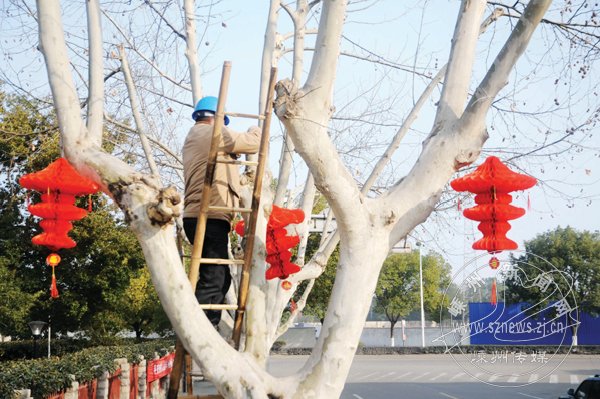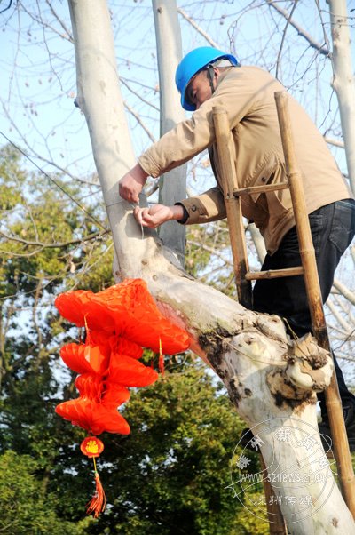 市园林管理处工作人员在挂灯笼