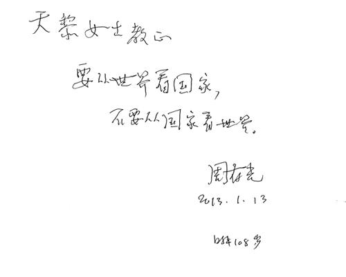最近,中国学术界百岁泰斗、德高望重的周有光老先生,在其生日当天,特地题词赠于嵊州媳妇、中国画魂、著名人文学者周天黎。内容如下:“天黎女士教正 要从世界看国家,不要从国家看世界。周有光 2013.1.13.时年108岁”。
