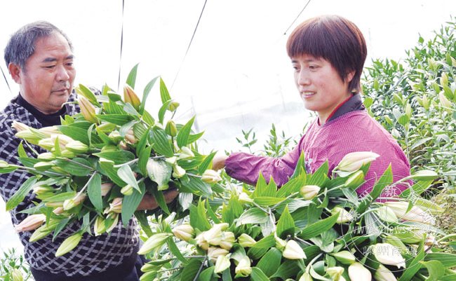 1月30日,三江街道忠铨村的百合花基地内,花农正在采收鲜百合花。据悉,目前我市的花卉种植面积目前已超12万亩,从事花卉产业的农户达1.5万户,形成了4万亩连片面积千亩以上的7个花木区域地带。