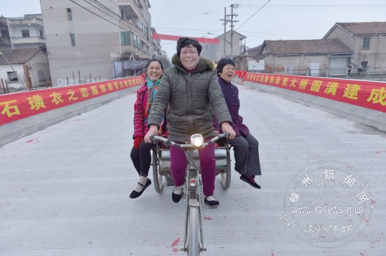一位大妈骑着三轮车,满脸笑容地通过石璜桥。昨日,重建的石璜桥通车。