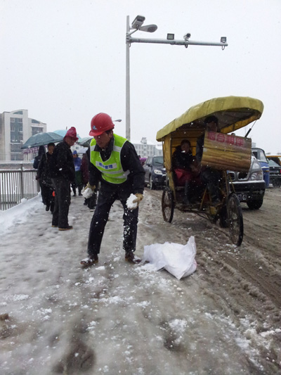 图为市政设施管理处桥梁管理工作人员正在西桥撒盐。