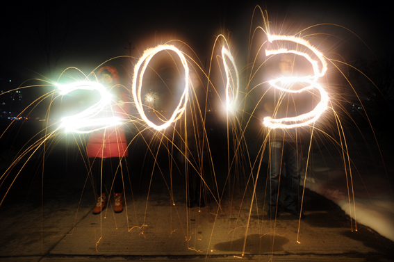 除夕夜,市民除了燃放各种烟花爆竹,还很有创意地用烟花写下各种文字,来迎接农历蛇年的到来。