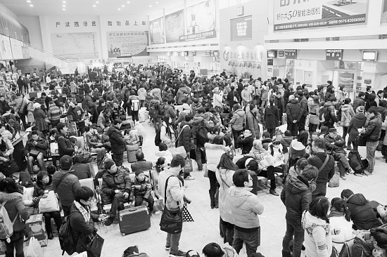 2月15日,嵊州市迎来春运返程的又一个高峰日,仅该市客运中心当日发送旅客近1万人次。图为旅客在该市客运中心候车大厅内候车的热闹场景。