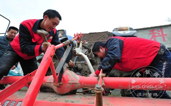 近日,我市农机部门和三界永明农机专业合作社的农机维修人员正奔波在全市各地,对春耕生产的农业机械进行安全性能检测,同时加大新农机的推广力度,促进春耕生产的顺利开展。图为2月20日,市农机维修人员正在仁山粮食生产全程机械化专业合作社维修农机的现场。