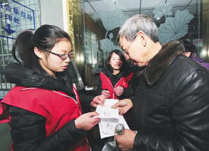 21日,一名大学生志愿者正为患者提供帮助。从1月23日起,逾百名寒假返乡的大学生来到嵊州市人民医院,加盟嵊州市人民医院志愿者服务队伍,为就诊患者开展医疗咨询、护送陪同、取送打印检验报告单、提供生活护理等服务。