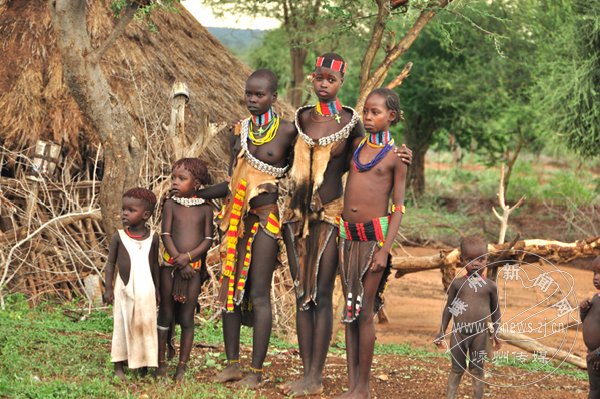 下午我们到达孔索小镇的部落街市。令人称奇的是,部落的人群身着极少的衣服,脸上、身上涂抹着不同颜色及图案;脖颈上、手臂上带着金银等饰品,妇女上身裸露,下身用羊皮裹披。许多人设有小摊,卖自己手工制作的木雕品、饰品、朱红粉,他们频频向我们打招呼,但如需拍摄,定要讲好价格,大约两元人民币。无论你到哪里,一定会跟随一群妇女、孩童,缠着你要钱、要物。据说,这种方式已成为这里的习惯。