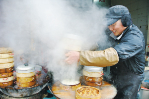 一家普通的包子店,这样的小笼包每天至少要做100笼以上,多的达两三百笼。(张亮宗摄)