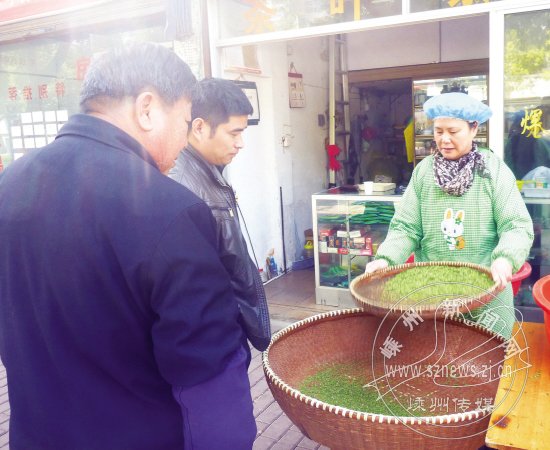 春暖花开,本地龙井茶也悄悄上市了。据官河横路上的一家茶叶店店主吴慧娟介绍,今年他们店的第一批本地龙井茶于3月5日上市,相比去年要提早一周左右。图为吴慧娟在店门口筛选龙井茶。