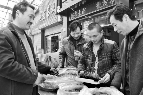 3月7日,嵊州中国茶叶城开始交易本地新上市的越乡龙井,目前新上市的是早茶品种乌牛早,每公斤交易价格在800元左右,价格与往年相比基本持平。图为茶商正在定价。