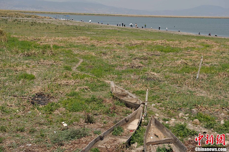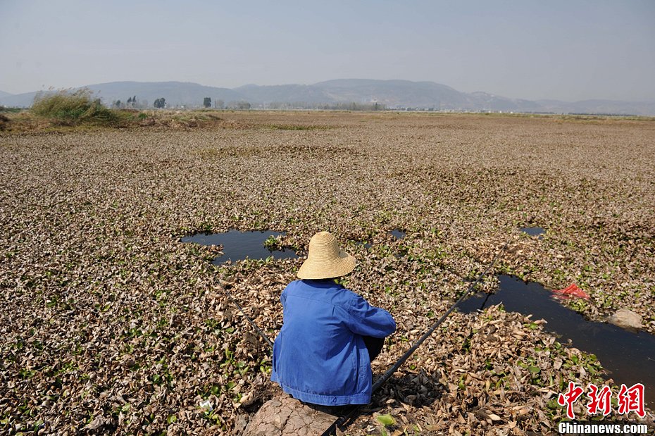 3月21日,民众在杞麓湖钓鱼。杞麓湖位于云南省玉溪市通海县,是云南九大高原湖泊之一,由于持续干旱的影响,杞麓湖大面积干涸。云南省气象台于3月20日发布干旱橙色预警,丽江、大理、昆明、楚雄、曲靖、保山、昭通、玉溪北部等地区存在重度及以上气象干旱,预计未来七天,上述大部地区无明显降水,气象干旱将持续。中新社发刘冉阳摄