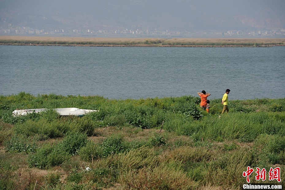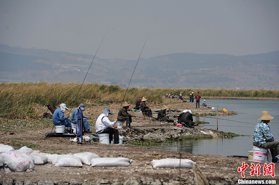 杞麓湖位于云南省通海县,是云南九大高原湖泊之一,径流面积354平方公里。截至3月21日,湖水水位1.19米,低于法定水位1.31米,蓄水量4736万方,少于法定水量3704万方。由于持续干旱的影响,杞麓湖大面积干涸,不少湖域的湖底已经裸露在外,长满杂草。图为3月21日,在湖中钓鱼的民众。中新社发刘冉阳摄