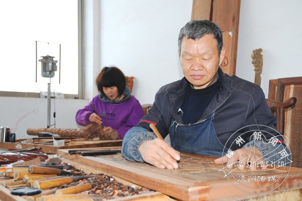 昨日上午,位于金庭镇的林伟红木家具厂内,雕刻师傅正在对一块花板进行加工。红木家具价格持续走高以后,林伟红木家具厂坚持高质量,追求精益求精,在省内外红木高端市场占得一席之地。