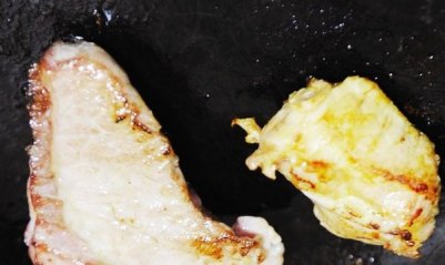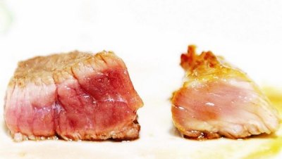 下油锅后,牛肉(左)发白,猪肉发黄(图一)
