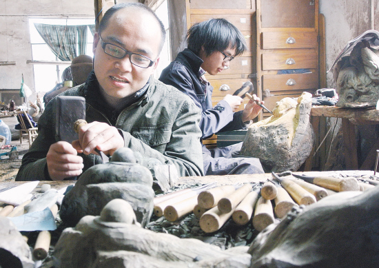 第8届义乌文博会将于4月27日至30日在义乌国际博览中心举行。本届义乌文博会以“打造文化产品交易平台,推动文化产业跨越发展”为主题,与往届相比,今年的文博会加大了推广力度,提升了展会专业化程度,文化创意主题更加鲜明,配套活动丰富多彩。图为4月3日,嵊州艺术村的根艺师傅们正在雕刻准备参展的精品根雕。