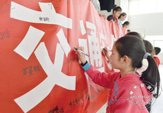 为大力营造文明交通“人人有责、人人共享”的良好氛围,昨日下午,由市文明办、团市委、教体局、公安局和交通局联合举办的“小手拉大手、文明出行进万家”活动启动仪式在城北小学举行,在场的师生代表和家长代表约400人在横幅上签名。市交警大队的警官还为同学们和家长们上了交通安全知识课。图为学生代表在宣传横幅上签名。