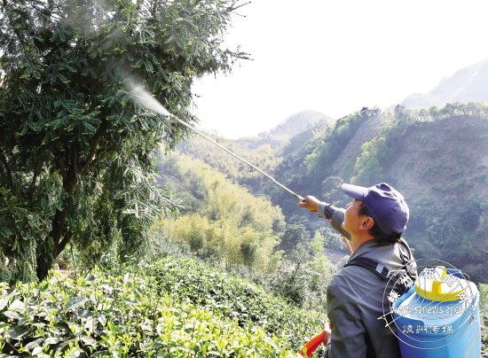 近日,谷来镇袁郭岭村的榧农正忙碌着给榧树喷洒花粉。据介绍,香榧人工授粉是保证香榧丰收的重要手段,近期是榧树最佳授粉时期。图为榧农为榧树进行人工授粉。