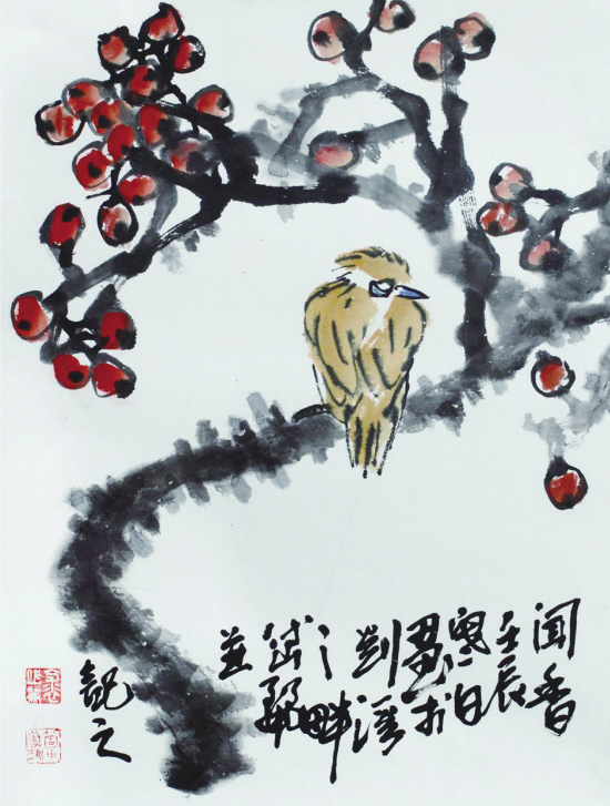 翻开裘岱丽的每一幅画卷,首先让人感受到的不是丹青的痕迹,而是画家深藏其中的那种蕴涵与语言。作品《深秋野趣》就是以奔放的墨彩,刻画出了深秋季节山乡野坡上那一簇簇耀眼的果实,在寒霜的洗礼下,显得格外倔强峥嵘、生机盎然。整幅画面墨色淋漓,又层次分明,显得大气磅礴,可以看出,作者虽在表现秋天的丰收,实际上是在赞美一种不畏风霜、迎难而上的开拓精神;作品《翠盖依依拥红妆》笔意连贯、墨韵生动,从这浓浓淡淡的墨韵中,可以让人感受到一种蓬勃向上的精神力量。