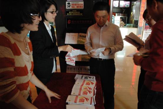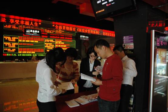 4月18日上午,中信银行绍兴分行配合人民银行绍兴市中心支行在咸亨国际影城统一开展《征信业管理条例》宣传活动。图为中信银行绍兴分行员工正在向前来观影的市民介绍《条例》内容。