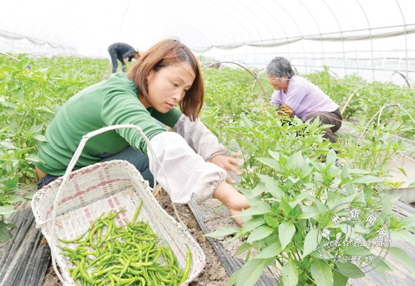 图为市兴良蔬菜专业合作社村民正在采摘小辣椒。