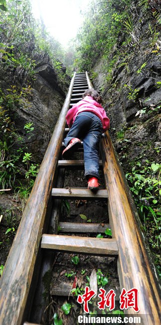 湖南张家界桑植县张家湾村的余启运兄妹,每周都要攀爬近乎垂直立在悬崖峭壁上的“天梯”上下学。近日,记者跟随余启运兄妹走完了这条艰难的“求学路”,在一个多小时的山路上,艰难的不仅是“天梯”,还有悬崖窄道、湿滑的怪石路、泥地等。余妹妹身手很灵巧,不一会儿就爬上“天梯”。这两架木梯总长几十米,近乎垂直地贴在岩壁上,两端没有任何固定;天梯两侧,除了高耸的悬崖,别无他物。