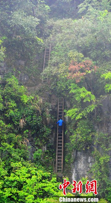 湖南张家界桑植县张家湾村的余启运兄妹,每周都要攀爬近乎垂直立在悬崖峭壁上的“天梯”上下学。近日,记者跟随余启运兄妹走完了这条艰难的“求学路”,在一个多小时的山路上,艰难的不仅是“天梯”,还有悬崖窄道、湿滑的怪石路、泥地等。等所有人都爬完后,余启运才开始攀爬“天梯”。这两架木梯总长几十米,近乎垂直地贴在岩壁上,两端没有任何固定;天梯两侧,除了高耸的悬崖,别无他物。中新社发杨华峰摄