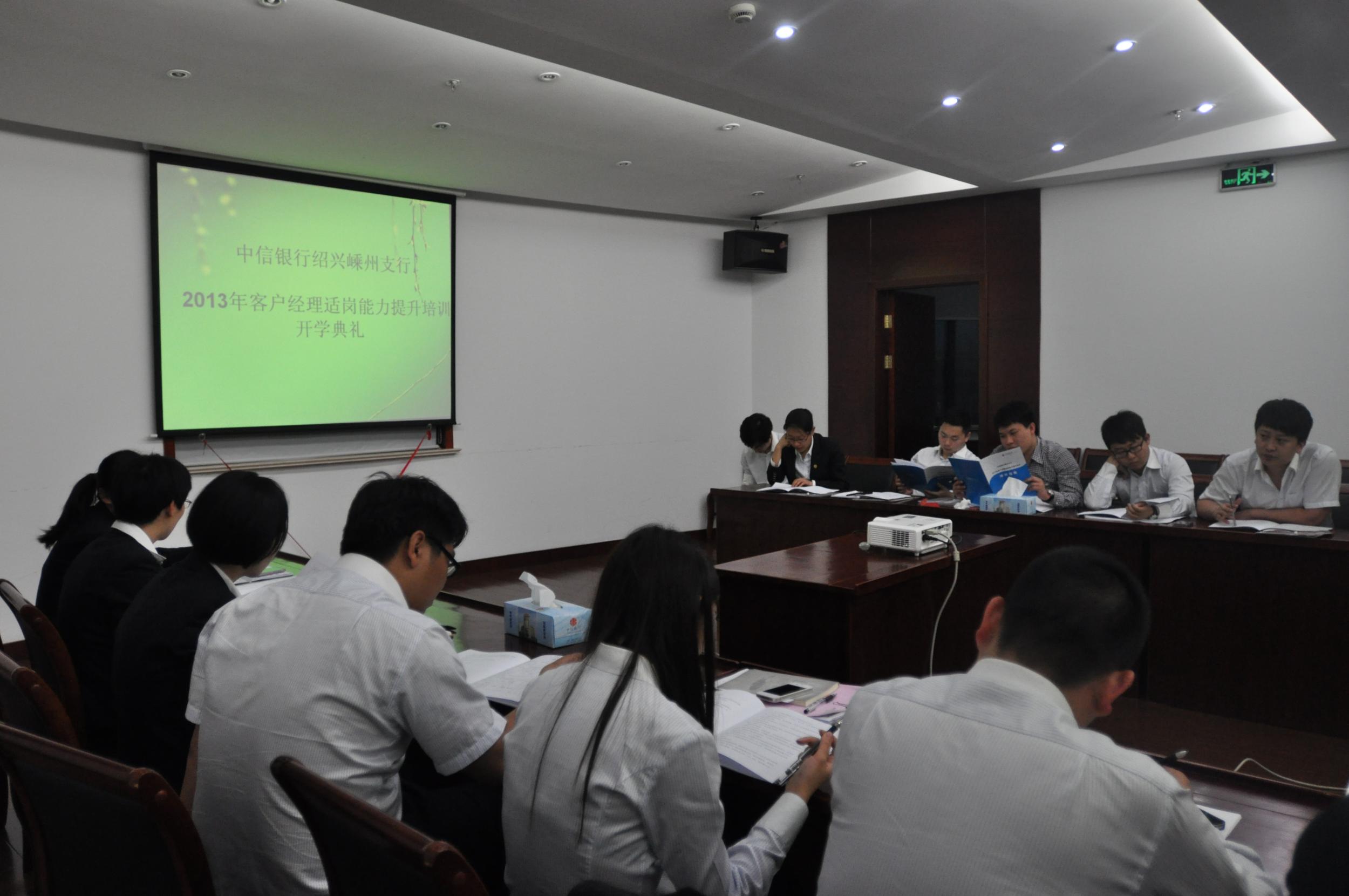 5月6日晚,中信银行嵊州支行2013年客户经理适岗能力提升培训班开学典礼在支行六楼会议室举行。参加此次开学典礼的有支行班子领导、培训班全体学员和支行内部兼职老师。
