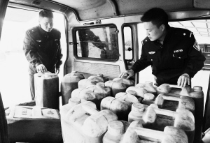 图为嵊州市公安局三界派出所民警正在检查嫌疑人运油的面包车。