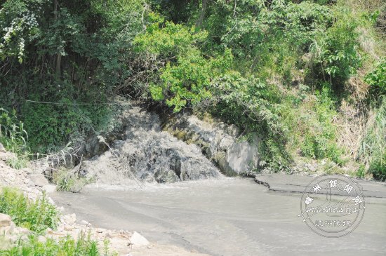 三界大桥建设工地边,有一管道向曹娥江排污水