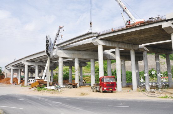 104国道嵊州段改建工程稳步推进。7标段圳塍分离式立交大桥已架设大桥梁板564片,完成梁板总数的95%,预计6月底全面完成立交大桥的梁板安装(图一)。彭山隧道工程开挖已完成95%。该工程左线已于去年底顺利贯通,全长1085米的右线还剩230米,预计6月中下旬可贯通。图为施工人员正在忙碌的场景(图二)。