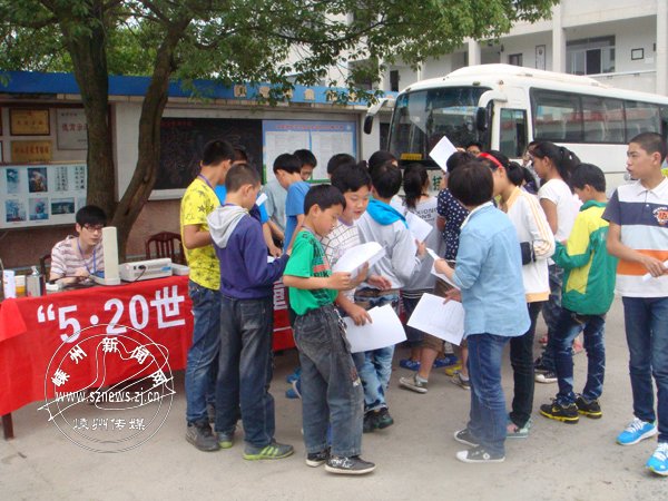 图为小分队成员向金庭镇中学生分发宣传资料。