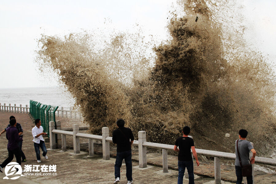 5月27日,正是农历四月十八。下午,钱江潮迎来凶猛夏潮。在海宁老盐仓回头潮观赏点,大潮冲天而起,游客们纷纷躲避。