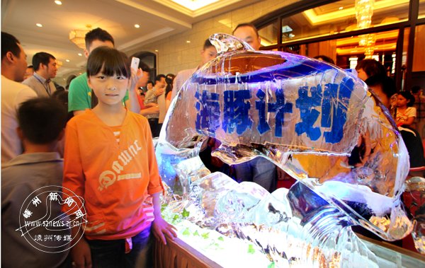 图为小朋友纷纷与“海豚”合影。