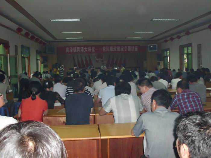为进一步提高全体机关干部的思想政治素质,切实推进党风廉政建设工作。6月7日上午,黄泽镇举办了“泽风大讲坛”———党风廉政建设专题讲座。全体镇机关干部、各村书记、主任、村监委主任及全体大学生村官参加了上午的大会,大会由镇纪律检查委员会书记夏玲燕同志主持,市纪委常委陈勇、黄泽镇检察室主任王军分别讲课。讲坛结束后,大会还进行了“黄泽镇党风廉政建设暨党员先锋指数考评”,党委书记王建勇同志作重要讲话。