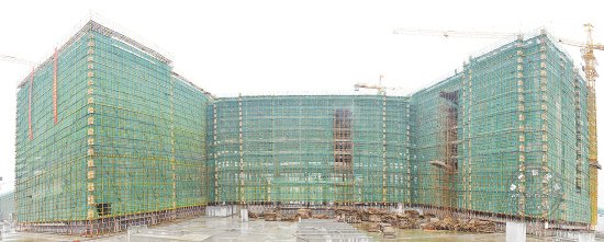 在建中的市新医院为多幢低层建筑,日前,新医院主楼3幢住院部大楼实现结顶,土建工程基本完工。图为已结顶的新医院住院部大楼。