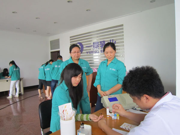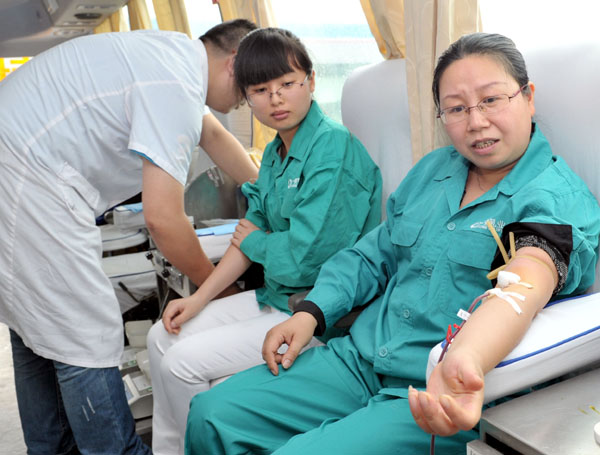 6月14日,无偿献血大巴驶进绍兴一景乳业有限公司,公司积极组织员工参与无偿献血活动。此次活动包括专家义诊、造血干细胞捐献登记采样、无偿献血、免费用血咨询。经过体检筛选,共有27人参与无偿献血,献血量达7300毫升,同时有21人参加造血干细胞捐献登记和采样。图为一景乳业有限公司员工参与无偿献血。