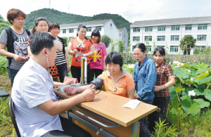 6月13日,嵊州市仙岩镇计生站、社区卫生服务中心联手开展的“夏日进村入企业提供医疗、计生服务”活动,率先在该镇添亿电子等企业展开。图为企业外来务工妇女正在接受免费服务。