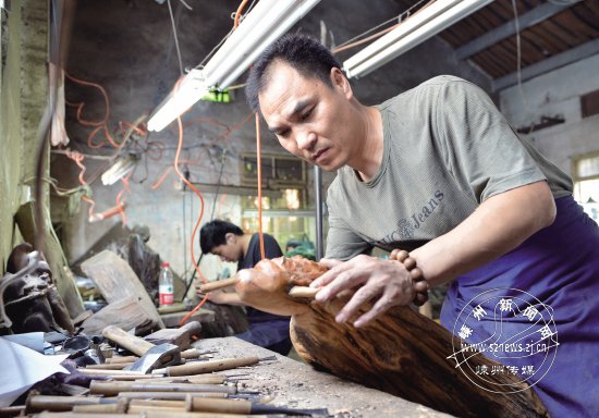 日前,11家单位被正式命名为绍兴市首批文化产业示范基地,嵊州艺术村名列其中。艺术村已成为我市民间工艺产业的发展中心,现有100余位民间艺人在此汇聚。图为省工艺美术大师郑兴国在艺术村里进行根雕创作。
