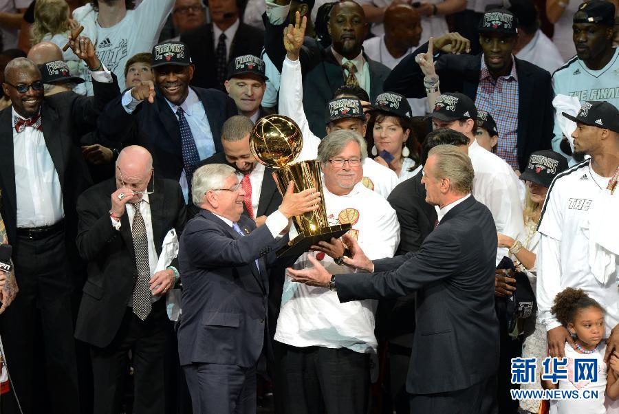 当日,在NBA总决赛第七场比赛中,迈阿密热火队主场以95比88战胜圣安东尼奥马刺队,第三次夺得NBA总冠军。新华社记者王雷摄