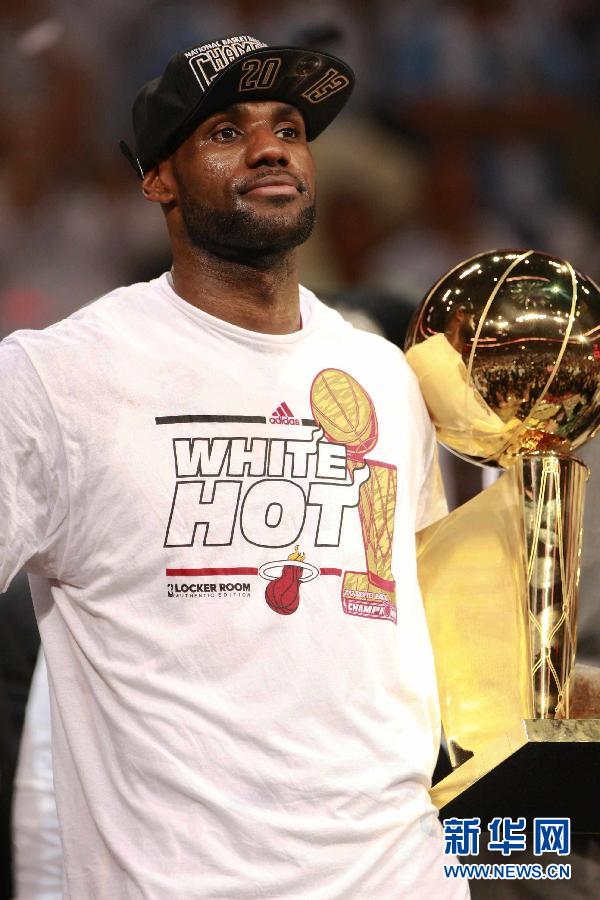 6月20日,热火队球员詹姆斯在颁奖仪式上手捧总冠军奖杯。