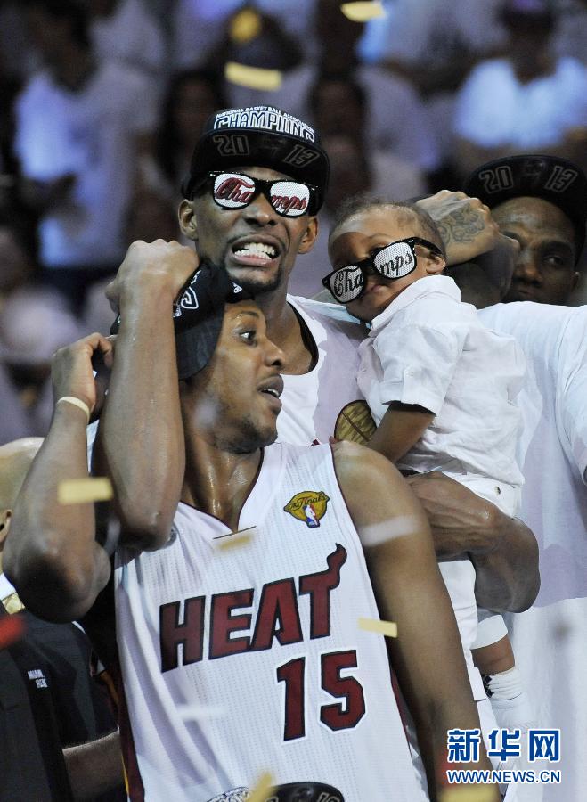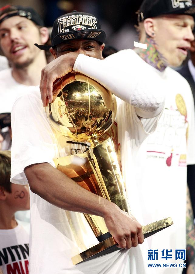 当日,在NBA总决赛第七场比赛中,迈阿密热火队主场以95比88战胜圣安东尼奥马刺队,以4比3的总比分,夺得NBA总冠军。新华社记者方喆摄