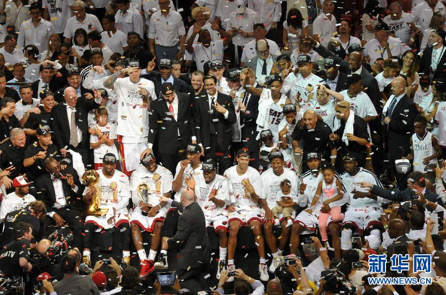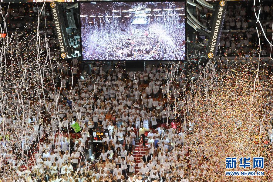 6月20日,当日,在NBA总决赛第七场比赛中,迈阿密热火队主场以95比88战胜圣安东尼奥马刺队,以4比3的总比分,夺得NBA总冠军。新华社记者王雷摄