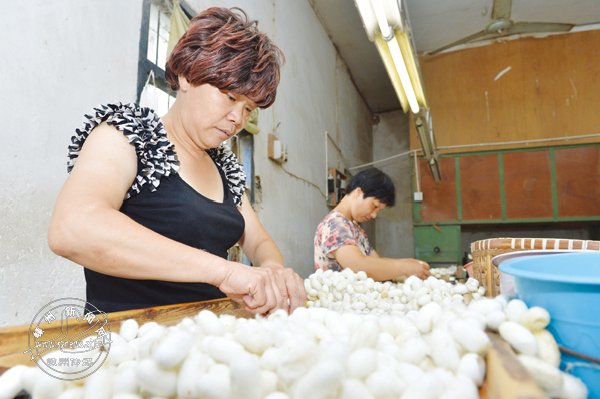 春茧收购刚刚结束,春茧加工便如火如荼地开展起来。经过选茧、煮茧、缫丝等多道工序便可制成蚕丝。据了解,今年全市春茧收购量为250多吨。图为市莎绫美服装服饰有限公司的工人正在选茧。