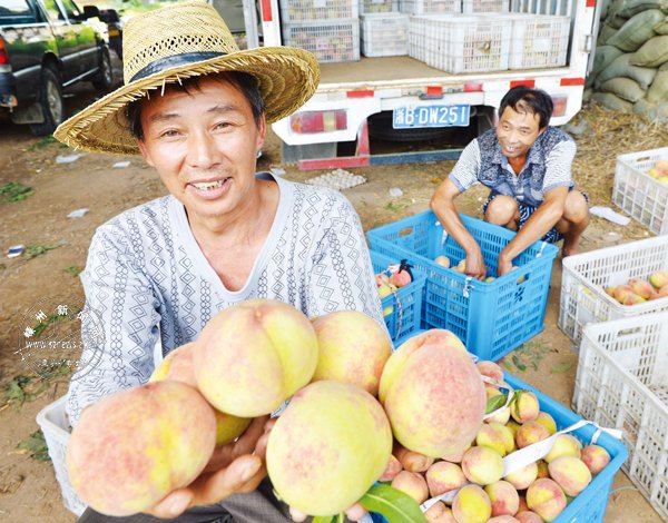 眼下正是桃子上市季节。由于今年气候良好,我市2.5万亩桃园喜获丰产。昨日,记者在鹿山街道江东村看到了如拳头般大小的桃子,有些个头大的甚至超过半斤重。这些品质良好的桃子吸引了很多外地客商前来收购,每公斤收购价在7元左右。
