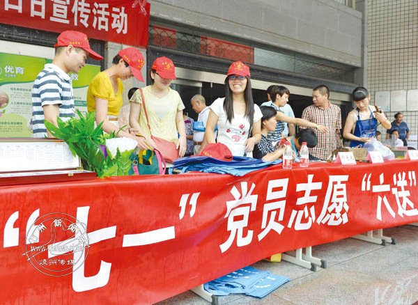 随着“七一”建党节的来临,我市基层党组织纷纷组织党员开展了形式多样的志愿服务活动。昨日上午,城南新区(三江街道)党员志愿服务活动在中国领带城开展,党员志愿者服务团队为当地居民开展了测量血压、钟表修理、配锁、理发、补鞋、禁毒宣传、反邪教知识、计生咨询等各种惠民服务,充分展现了共产党员的先进性和奉献精神。
