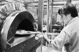 烧烤是嵊州许多旅游景点春季吸引游客的卖点。入夏后,春季的烧烤风刚过去,特色蛋糕、比萨、花式刨冰、西式面点等特色小吃就在各个景区出现了,引领夏日小吃经济的时尚潮流。图为嵊州星期八休闲景点内,一名工作人员正为游客烤制比萨饼。