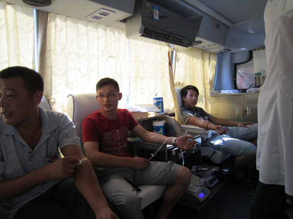 在献血现场,市中心血站的工作人员给前来献血的干部职工做采血检查并填写表格,大家也都积极地配合。图为献血现场。