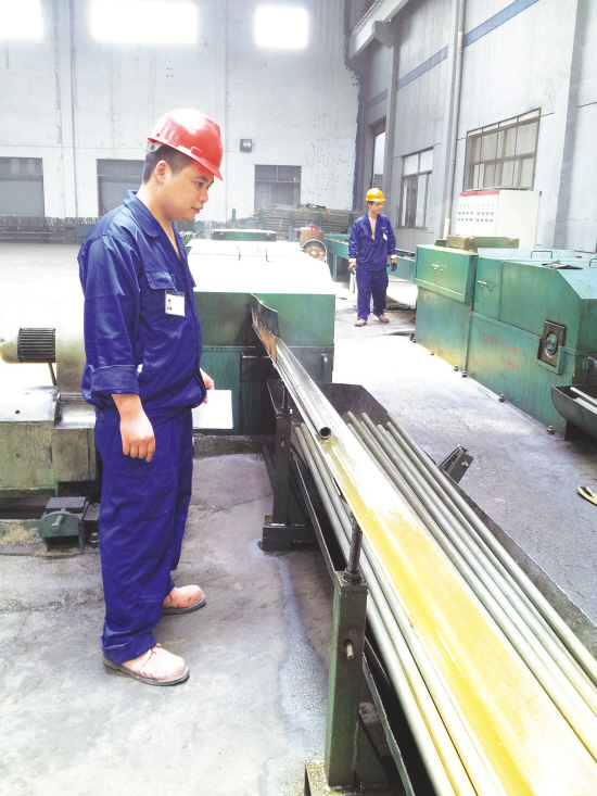 市恒鑫金属制管有限公司是一家专门生产特种钢管的企业,公司总投资8000多万元,5月份开始投产,产品一上马就呈现供不应求的趋势。该公司全部取用智能控制设备,预计今年产值就可以达到1个亿。图为车间一角。